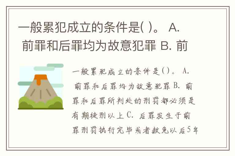 一般累犯成立的条件是( )。 A. 前罪和后罪均为故意犯罪 B. 前罪和后罪所判处的刑罚都必须是有期徒刑以上 C. 后罪发生于前罪刑罚执行完毕或者赦免以后5年内 D. 前罪和后罪均触犯同一罪名