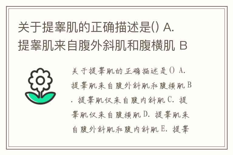 关于提睾肌的正确描述是() A. 提睾肌来自腹外斜肌和腹横肌 B. 提睾肌仅来自腹内斜肌 C. 提睾肌仅来自腹横肌 D. 提睾肌来自腹外斜肌和腹内斜肌 E. 提睾肌肌束呈袢状,排列稀疏