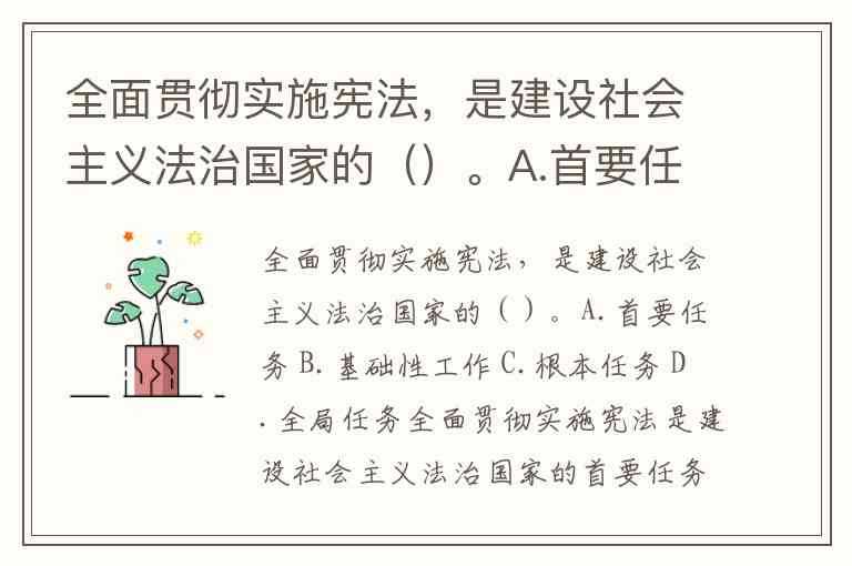 全面贯彻实施宪法,是建设社会主义法治国家的()。A.首要任务 B.基础性工作 C.根本任务 D.全局任务