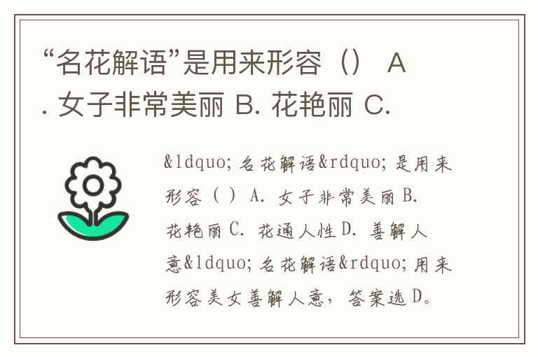 “名花解语”是用来形容() A. 女子非常美丽 B. 花艳丽 C. 花通人性 D. 善解人意