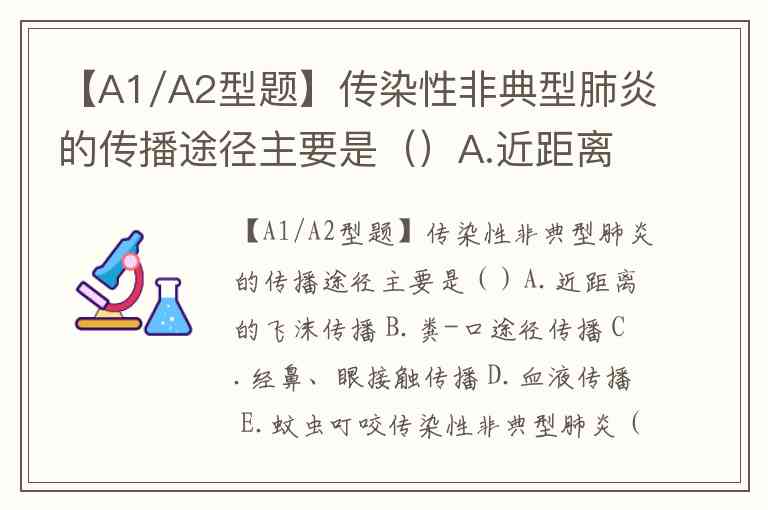 【A1/A2型题】传染性非典型肺炎的传播途径主要是()A.近距离的飞沫传播 B.粪-口途径传播 C.经鼻、眼接触传播 D.血液传播 E.蚊虫叮咬