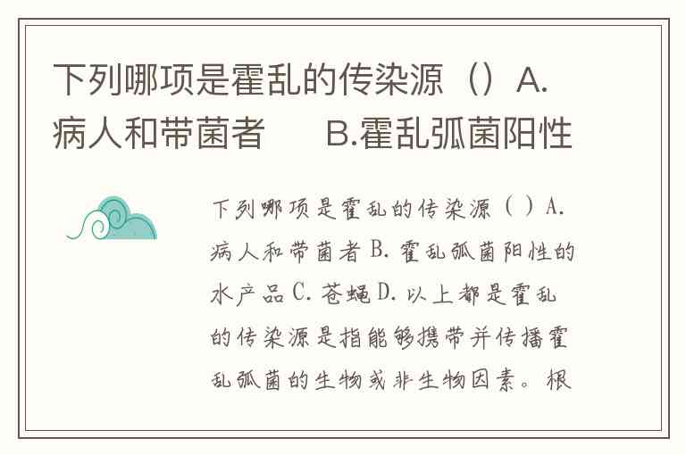 下列哪项是霍乱的传染源()A.病人和带菌者 B.霍乱弧菌阳性的水产品 C.苍蝇 D.以上都是