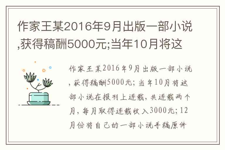 作家王某2016年9月出版一部小说,获得稿酬5000元;当年10月将这部小说在报刊上连载,共连载两个月,每月取得连载收入3000元;12月份将自己的一部小说手稿原件公开拍卖获得收入10万元。2016年王某就上述所得应缴纳个人所得税( )元。 A. 12432 B. 17232 C. 17176 D. 17760