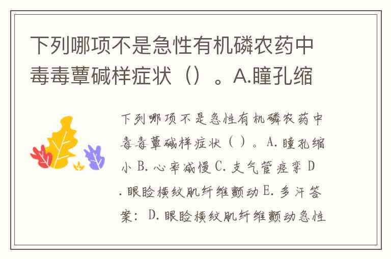 下列哪项不是急性有机磷农药中毒毒蕈碱样症状()。A.瞳孔缩小 B.心率减慢 C.支气管痉挛 D.眼睑横纹肌纤维颤动 E.多汗