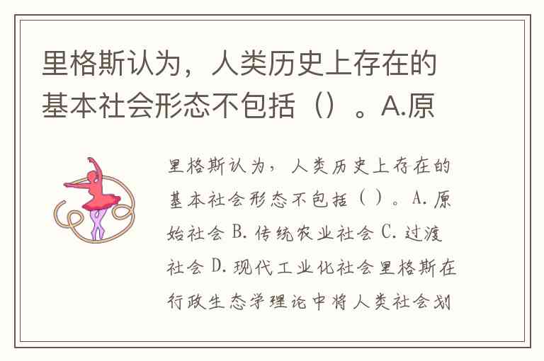 里格斯认为,人类历史上存在的基本社会形态不包括()。A.原始社会 B.传统农业社会 C.过渡社会 D.现代工业化社会