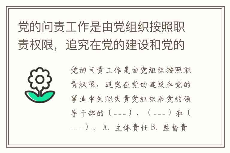 党的问责工作是由党组织按照职责权限,追究在党的建设和党的事业中失职失责党组织和党的领导干部的(___)、(___)和(___)。 A. 主体责任 B. 监督责任 C. 领导责任 D. 连带责任