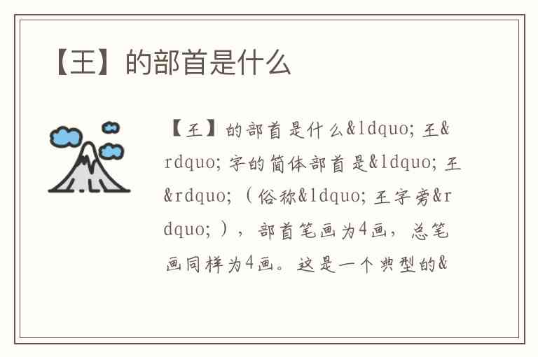 “王”字的简体部首是“王”(俗称“王字旁”),部首笔画为4画,总笔画同样为4画。这是一个典型的“独体字作部首”的例子,即字本身就是部首,无需拆分。