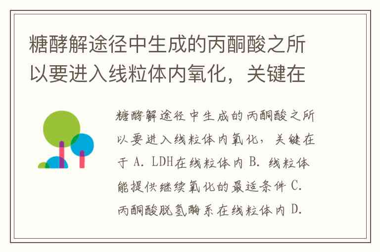 糖酵解途径中生成的丙酮酸之所以要进入线粒体内氧化,关键在于 A. LDH在线粒体内 B. 线粒体能提供继续氧化的最适条件 C. 丙酮酸脱氢酶系在线粒体内 D. 线粒体膜上有转运丙酮酸的载体 E. 除此去路别无他途