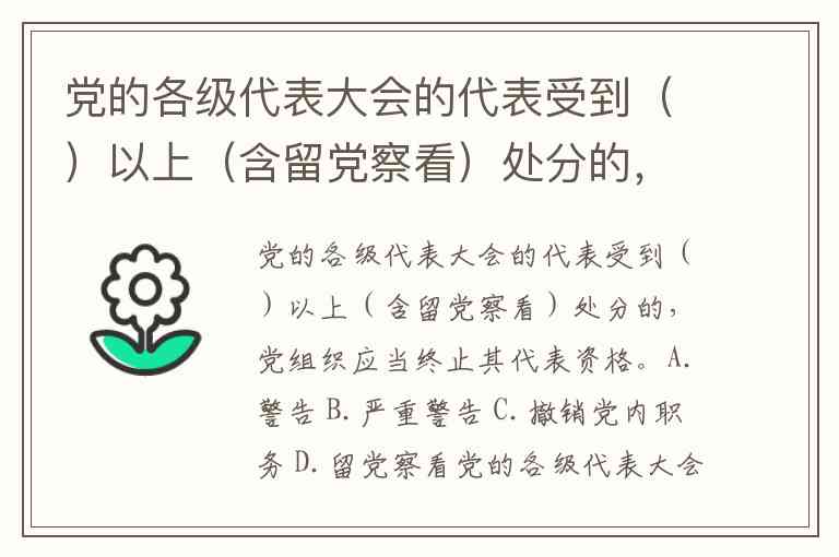 党的各级代表大会的代表受到()以上(含留党察看)处分的,党组织应当终止其代表资格。A.警告 B.严重警告 C.撤销党内职务 D.留党察看