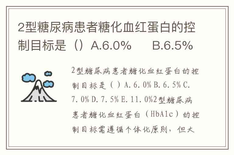 2型糖尿病患者糖化血红蛋白的控制目标是()A.6.0% B.6.5% C.7.0% D.7.5% E.11.0%