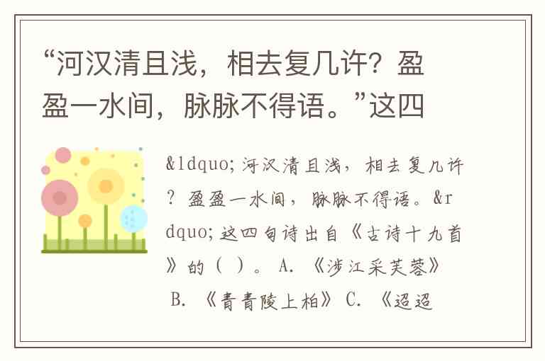 “河汉清且浅,相去复几许?盈盈一水间,脉脉不得语。”这四句诗出自《古诗十九首》的( )。 A. 《涉江采芙蓉》 B. 《青青陵上柏》 C. 《迢迢牵牛星》 D. 《青青河畔草》