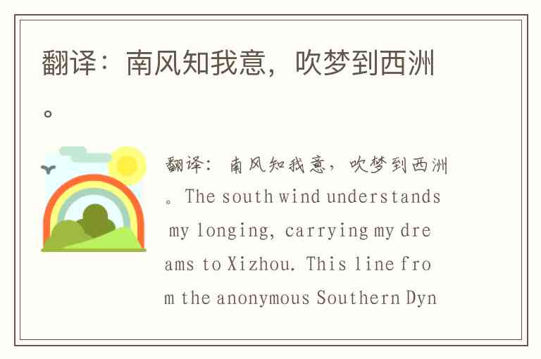 The south wind understands my longing, carrying my dreams to Xizhou. This line from the anonymous Southern Dynasties poem Ballad of Xizhou uses personification to transform the wind into a confidant that bridges physical separation. "South wind" (南风) symbolizes the warm breeze of late spring/early summer, traditionally associated with emotional yearning, while "Xizhou" evokes an idealized place of reunion or romantic longing in classical Chinese poetry. The concise two-line structure creates a vivid image of dreams physically transported by nature, capturing the universal ache of separation and hope for connection.