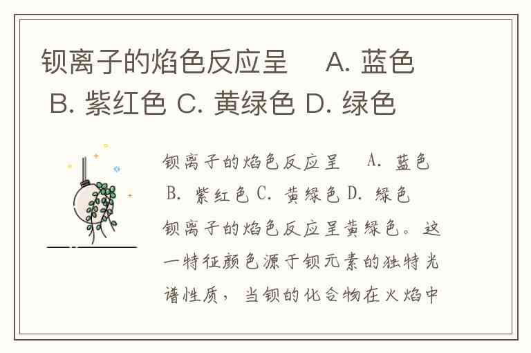 钡离子的焰色反应呈 A. 蓝色 B. 紫红色 C. 黄绿色 D. 绿色