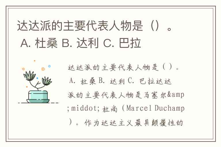 达达派的主要代表人物是()。 A. 杜桑 B. 达利 C. 巴拉