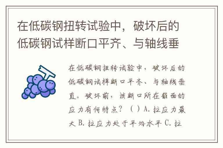 在低碳钢扭转试验中,破坏后的低碳钢试样断口平齐、与轴线垂直。破坏前,该断口所在截面的应力有何特点?()A.拉应力最大 B.拉应力处于平均水平 C.拉应力最小 D.剪应力最大 E.剪应力最小