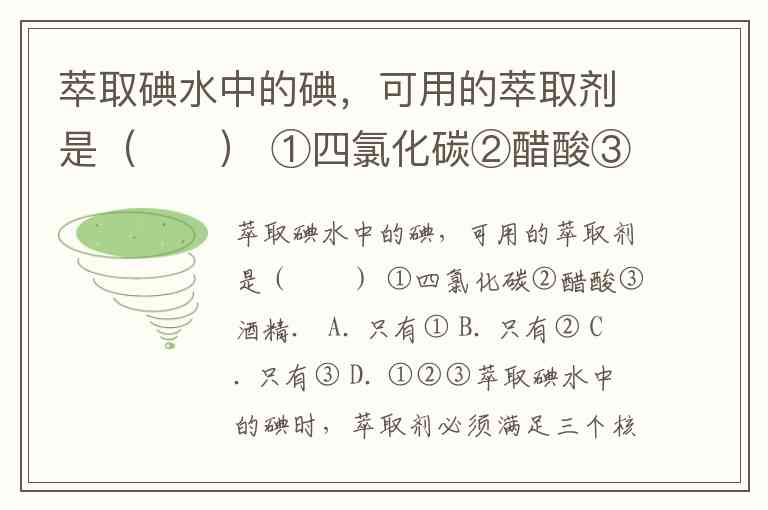 萃取碘水中的碘,可用的萃取剂是( ) ①四氯化碳②醋酸③酒精. A. 只有① B. 只有② C. 只有③ D. ①②③