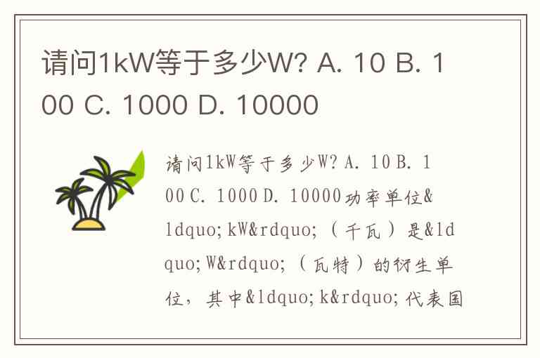 请问1kW等于多少W? A. 10 B. 100 C. 1000 D. 10000