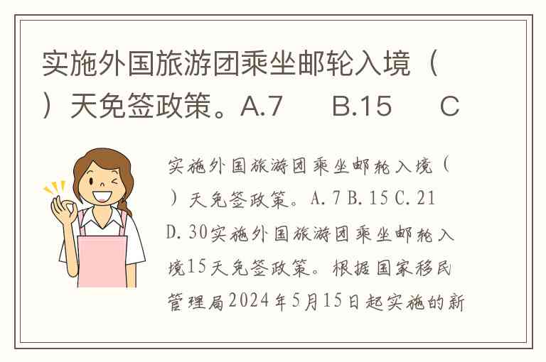 实施外国旅游团乘坐邮轮入境()天免签政策。A.7 B.15 C.21 D.30