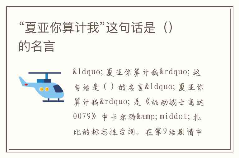 “夏亚你算计我”是《机动战士高达0079》中卡尔玛·扎比的标志性台词。在第9话剧情中,夏亚·阿兹纳布尔利用两人的“友谊”设下陷阱,误导卡尔玛攻击阿姆罗驾驶的RX-78-02高达,使其忽视后方的白色要塞。当卡尔玛的战机被击落、通讯器里传来夏亚的大笑时,他才意识到自己陷入复仇计划,盛怒之下喊出了这句台词。