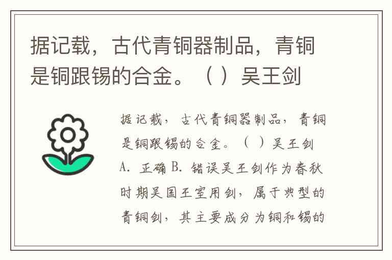 据记载,古代青铜器制品,青铜是铜跟锡的合金。( )吴王剑 A. 正确 B. 错误