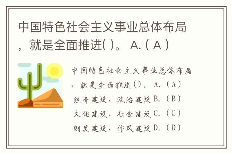 中国特色社会主义事业总体布局,就是全面推进( )。 A. ( A ) 经济建设、政治建设 B. ( B ) 文化建设、社会建设 C. ( C ) 制度建设、作风建设 D. ( D ) 生态文明建设