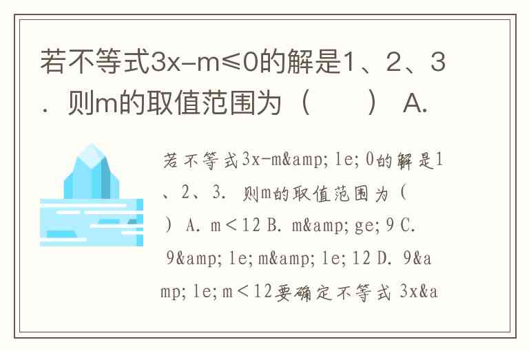 若不等式3x-m≤0的解是1、2、3.则m的取值范围为( ) A. m<12 B. m≥9 C. 9≤m≤12 D. 9≤m<12