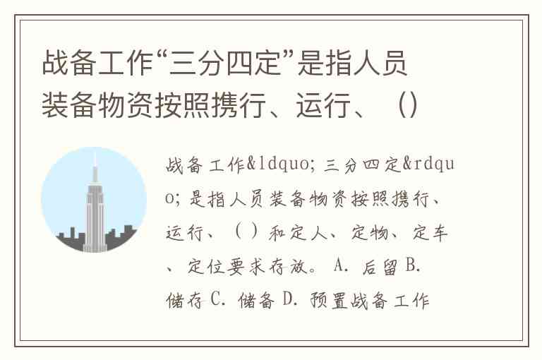 战备工作“三分四定”是指人员装备物资按照携行、运行、()和定人、定物、定车、定位要求存放。 A. 后留 B. 储存 C. 储备 D. 预置