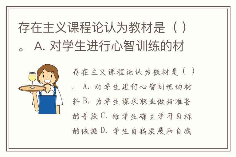 存在主义课程论认为教材是( )。 A. 对学生进行心智训练的材料 B. 为学生谋求职业做好准备的手段 C. 给学生确立学习目标的依据 D. 学生自我发展和自我实现的手段