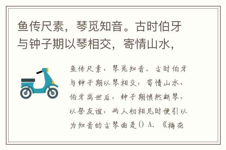 鱼传尺素,琴觅知音。古时伯牙与钟子期以琴相交,寄情山水,伯牙离世后,钟子期愤然断琴,以祭友谊,两人初相见时便引以为知音的古琴曲是() A. 《梅花三弄》 B. 《阳春白雪》 C. 《》 D. 《平沙落雁》