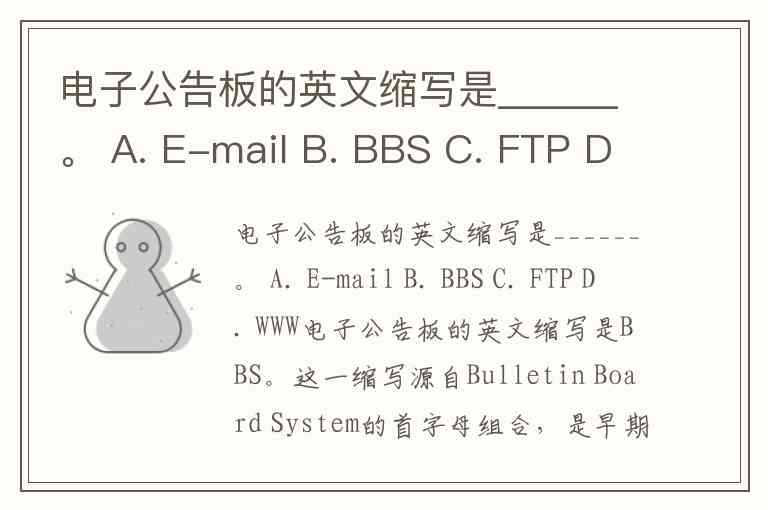 电子公告板的英文缩写是______。 A. E-mail B. BBS C. FTP D. WWW