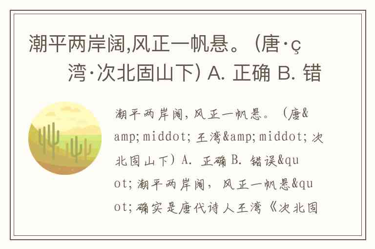 潮平两岸阔,风正一帆悬。 (唐·王湾·次北固山下) A. 正确 B. 错误