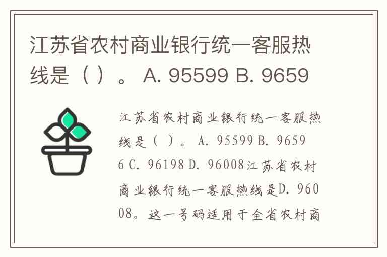 江苏省农村商业银行统一客服热线是( )。 A. 95599 B. 96596 C. 96198 D. 96008