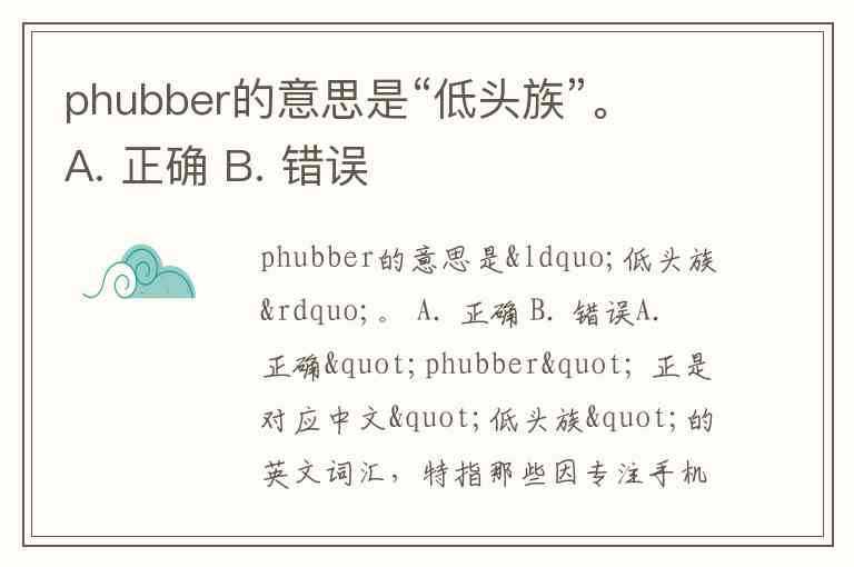 phubber的意思是“低头族”。 A. 正确 B. 错误