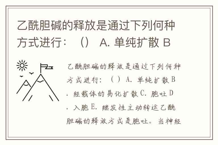 乙酰胆碱的释放方式是胞吐。当神经冲动到达神经末梢时,突触前膜的电压依赖性钙离子通道开放,钙离子内流触发突触小泡与前膜融合,通过开口将内含的乙酰胆碱释放到突触间隙,这一过程在生理学中被明确定义为胞吐。