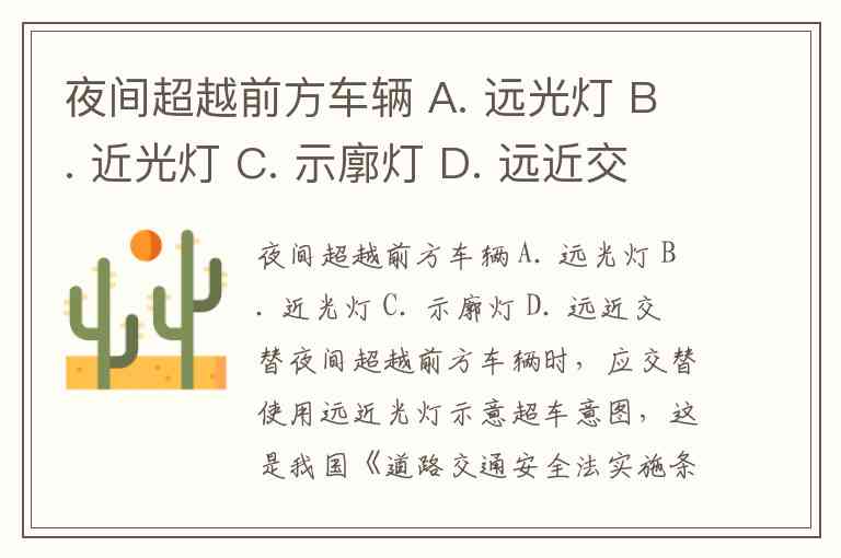 夜间超越前方车辆 A. 远光灯 B. 近光灯 C. 示廓灯 D. 远近交替
