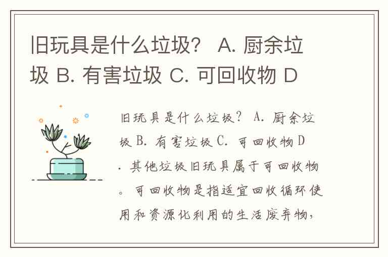 旧玩具是什么垃圾? A. 厨余垃圾 B. 有害垃圾 C. 可回收物 D. 其他垃圾