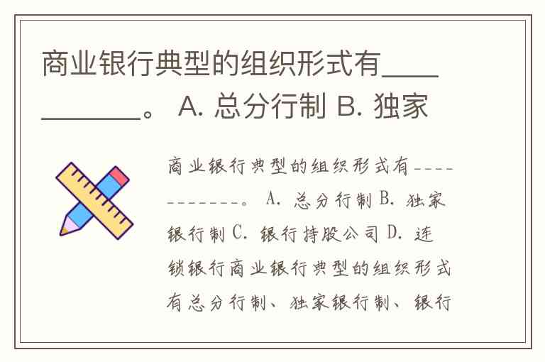 商业银行典型的组织形式有___________。 A. 总分行制 B. 独家银行制 C. 银行持股公司 D. 连锁银行