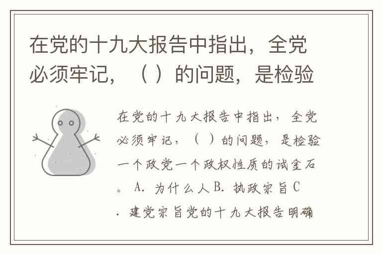 在党的十九大报告中指出,全党必须牢记,( )的问题,是检验一个政党一个政权性质的试金石。 A. 为什么人 B. 执政宗旨 C. 建党宗旨