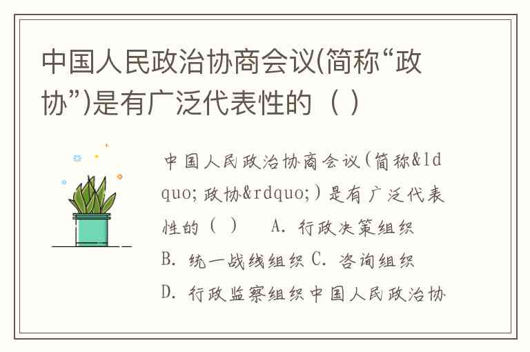 中国人民政治协商会议(简称“政协”)是有广泛代表性的( )。 A. 行政决策组织 B. 统一战线组织 C. 咨询组织 D. 行政监察组织