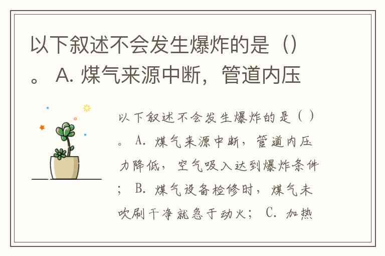 以下叙述不会发生爆炸的是()。 A. 煤气来源中断,管道内压力降低,空气吸入达到爆炸条件; B. 煤气设备检修时,煤气未吹刷干净就急于动火; C. 加热炉的点火方式采用先点火,后送煤气; D. 煤气设备在停产检修处理煤气时,只要设备内是正压,就可以动火。