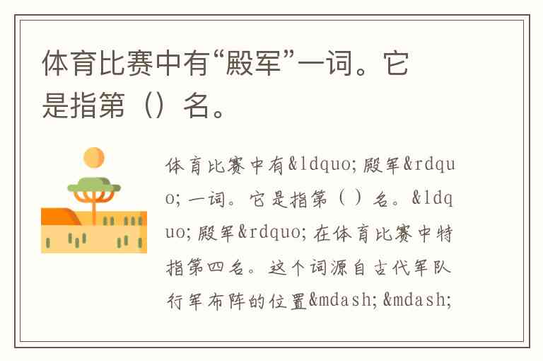 “殿军”在体育比赛中特指第四名。这个词源自古代军队行军布阵的位置——殿后之军,原指行军时担任后卫的部队,后逐渐演变为比赛名次的特定称谓,排在冠军(第一)、亚军(第二)、季军(第三)之后。