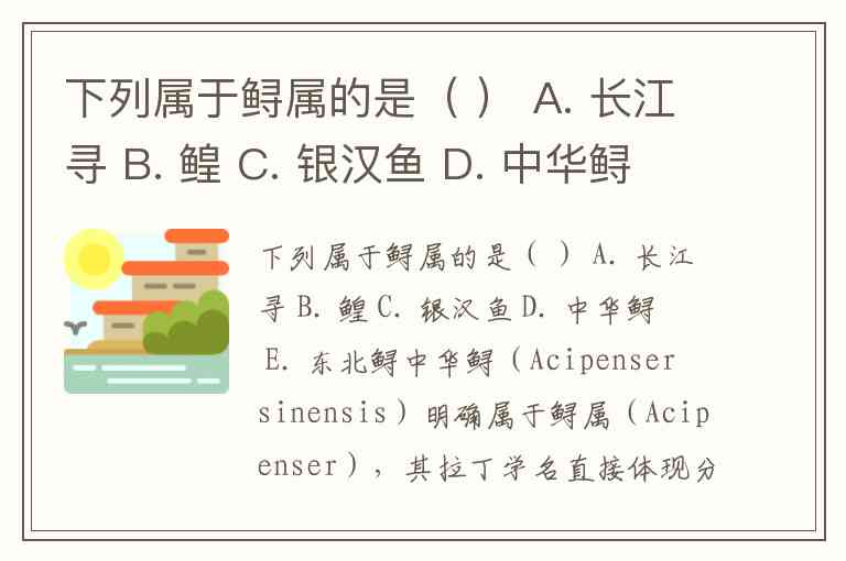 选项中需注意分类陷阱:鳇鱼(如达氏鳇)属于独立的鳇属(Huso),而非鲟属;银汉鱼属于银汉鱼目,与鲟形目无亲缘关系;“长江寻”可能为“长江鲟”的误写,长江鲟(达氏鲟)虽属鲟属,但选项A名称不规范,可能为干扰项。