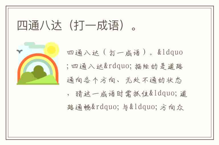 “头头是道”原指说话做事有条理,此处取字面意——“头”可理解为道路的起始或方向,“道”即道路,“头头是道”形象呼应了“四通八达”中各方向道路皆通畅的景象,既符合成语结构,又巧妙关联谜面含义。这一答案通过词语的多义性,将抽象的“通达”具象为“每条路都是道路”的生动表达。