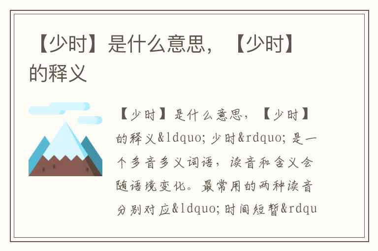 “少时”是一个多音多义词语,读音和含义会随语境变化。最常用的两种读音分别对应“时间短暂”和“人生阶段”两种核心含义,在古文和现代汉语中都有广泛应用。