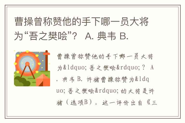 曹操称赞为“吾之樊哙”的大将是许褚(选项B)。这一评价出自《三国志·许褚传》,曹操初见许褚时便被其“容貌雄毅,勇力绝人”的特质震撼,当场以西汉开国猛将樊哙类比,足见对其勇武与忠诚的认可。