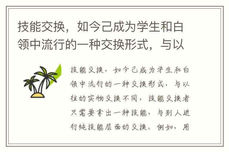 技能交换,如今己成为学生和白领中流行的一种交换形式,与以往的实物交换不同,技能交换者只需要拿出一种技能,与别人进行纯技能层面的交换。例如,用汽车陪驾交换学钢琴。下列关于“技能交换”的说法正确的是() A. “技能交换”属于商品流通 B. “技能”的本质是一般等价物 C. 交换中的“技能”是商品 D. 交换中的“技能”具有使用价值,但无价值