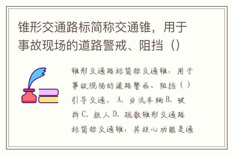 锥形交通路标简称交通锥,用于事故现场的道路警戒、阻挡()引导交通。 A. 分流车辆 B. 破拆 C. 救人 D. 疏散