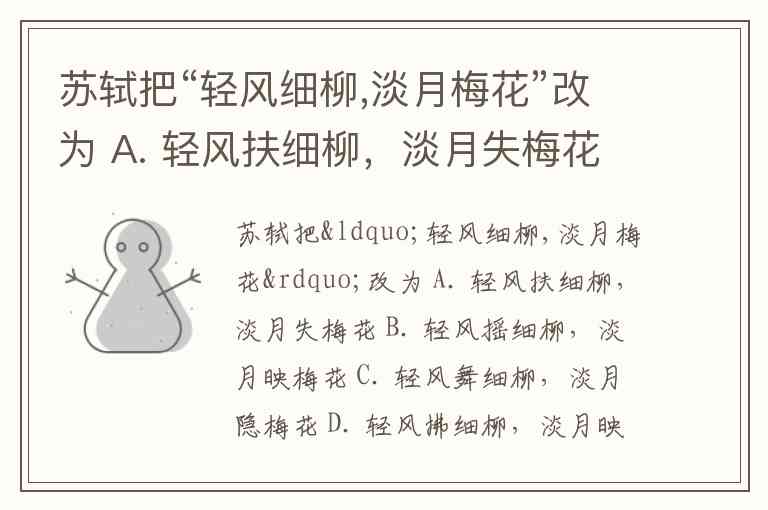苏轼把“轻风细柳,淡月梅花”改为 A. 轻风扶细柳,淡月失梅花 B. 轻风摇细柳,淡月映梅花 C. 轻风舞细柳,淡月隐梅花 D. 轻风拂细柳,淡月映梅花
