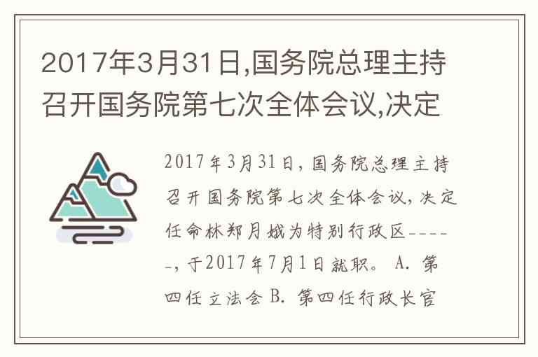 2017年3月31日,国务院总理主持召开国务院第七次全体会议,决定任命林郑月娥为特别行政区_____,于2017年7月1日就职。 A. 第四任立法会 B. 第四任行政长官 C. 第五任立法会 D. 第五任行政长官