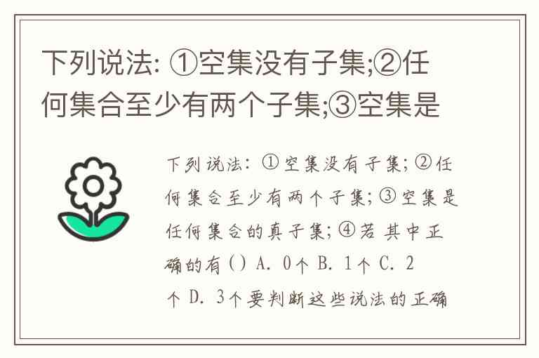②任何集合至少有两个子集:错误。空集只有一个子集(即自身),非空集合才有至少两个子集(空集和自身)。